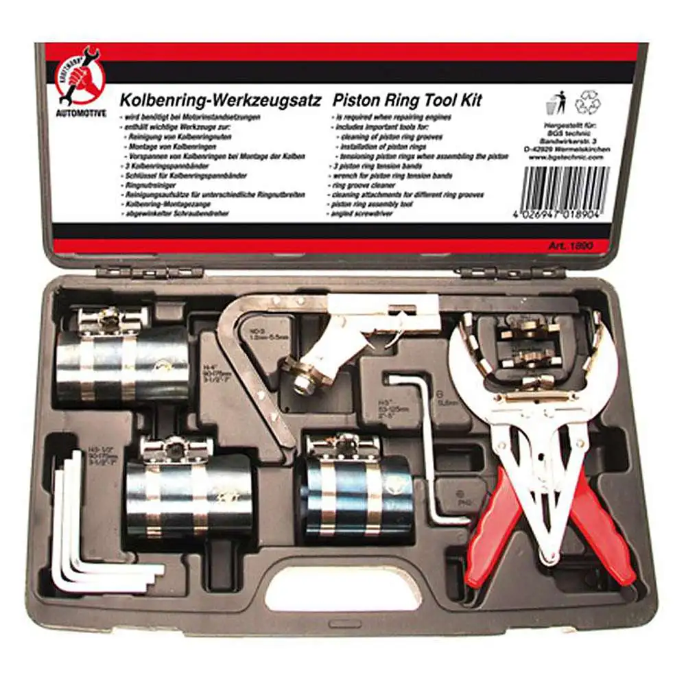 - Innhold – 3 stempelringer stramme stropper – viktige for stempelringstrammebånd – Ringnutreiniger – rengjøring vedlegg for ulike Ringnutbreiten – Piston Ring montering Tenger – vinklet skrutrekker